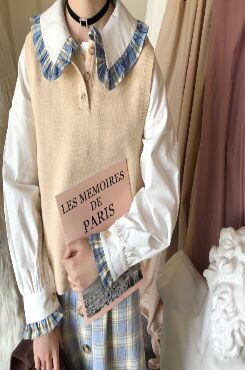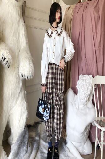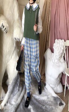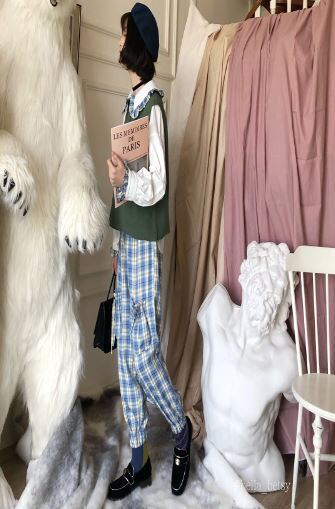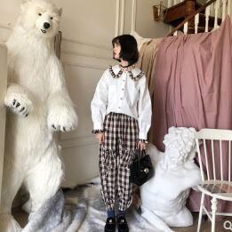 秋冬のトップスとパンツのセットです。シャツのフリルがパンツのチェックとおそろいのデザインです。カジュアルで快適にすごせます。