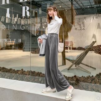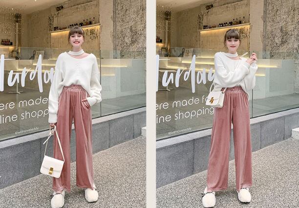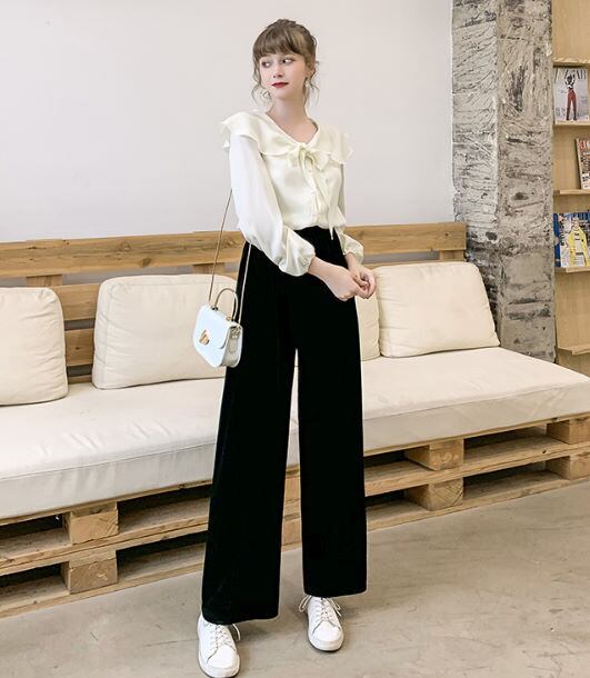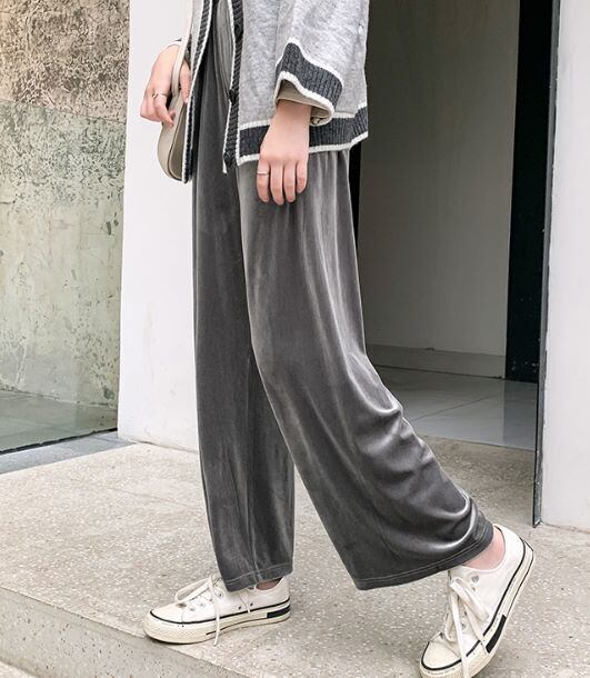 ハイウエストで、ゆったりしたカジュアルパンツです。体型をカバーしてくれるサイズと、光沢のある素材がおしゃれに見えます。